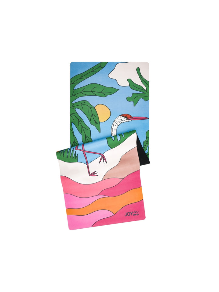 Druga grafika to wizualny zapis asany Krounchasana (pozycja czapli). Symbolizuje dążenie do lekkości, które wyrasta ze stabilnego, mocnego fundamentu – dokładnie tak, jak dumny ptak wpisany w tropikalny krajobraz. To przypomnienie, że prawdziwa siła pozwala nam unosić się wyżej.