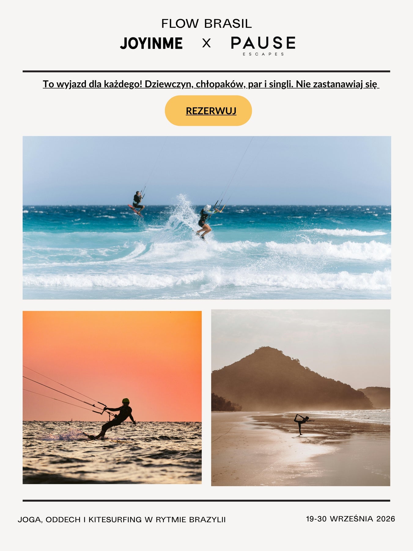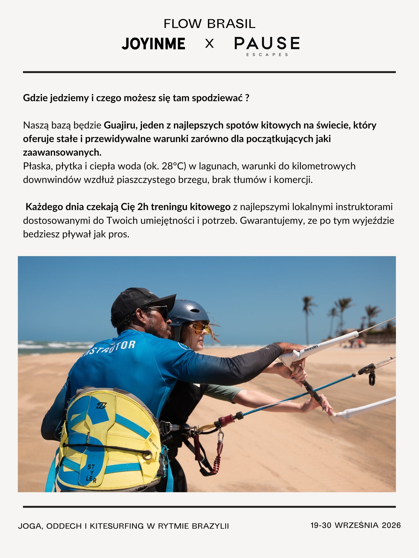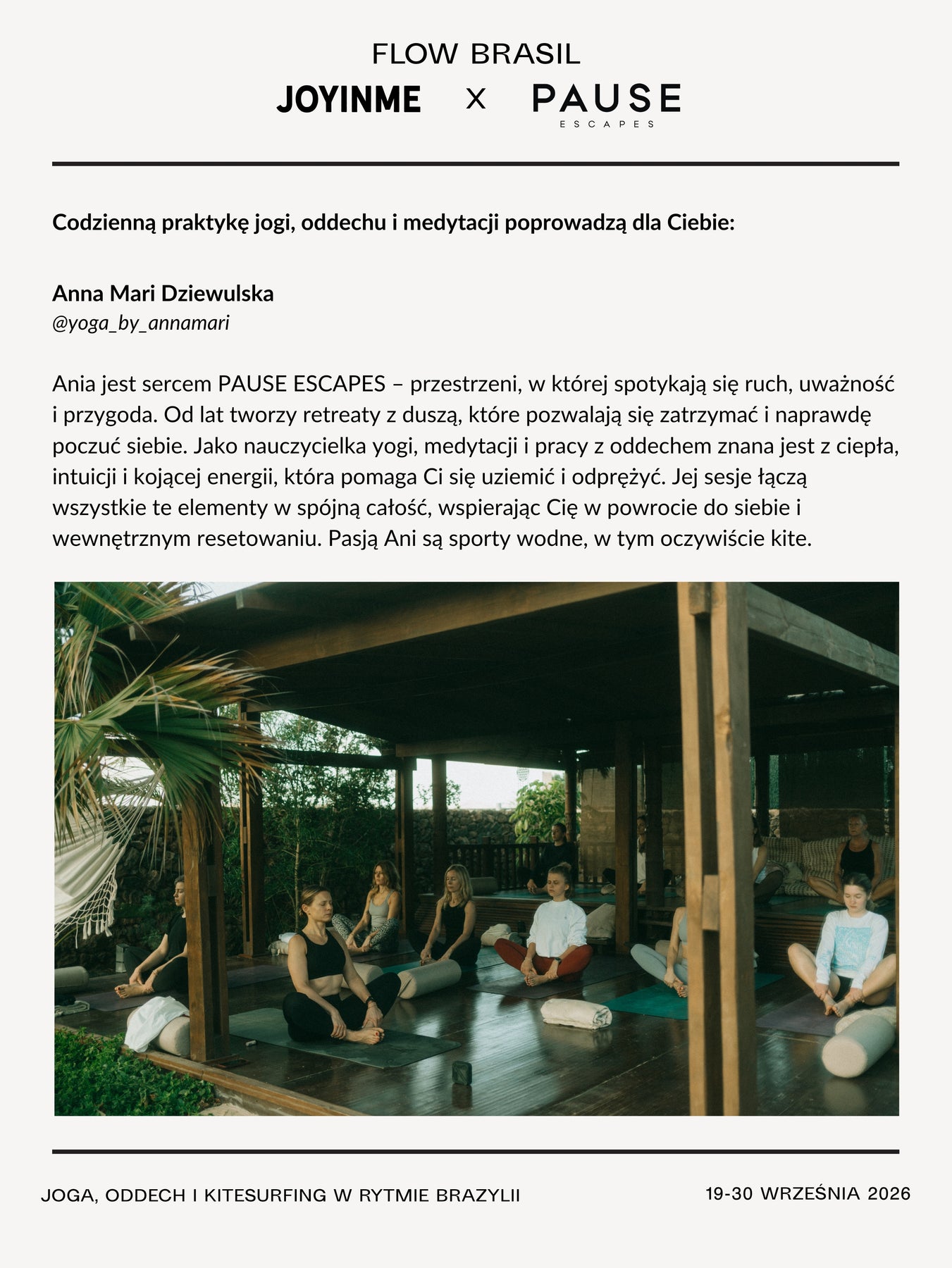 Anna Mari Dziewulska - Ania is the heart of PAUSE ESCAPES – a space where movement, mindfulness, and adventure meet. For years, she has been creating soulful retreats that allow you to pause and truly feel yourself. As a teacher of yoga, meditation, and breathwork, she is known for her warmth, intuition, and soothing energy that helps you ground and relax. Her sessions combine all these elements into a cohesive whole, supporting you in your return to yourself and inner reset. Ania's passion is water sports, including, of course, kitesurfing.