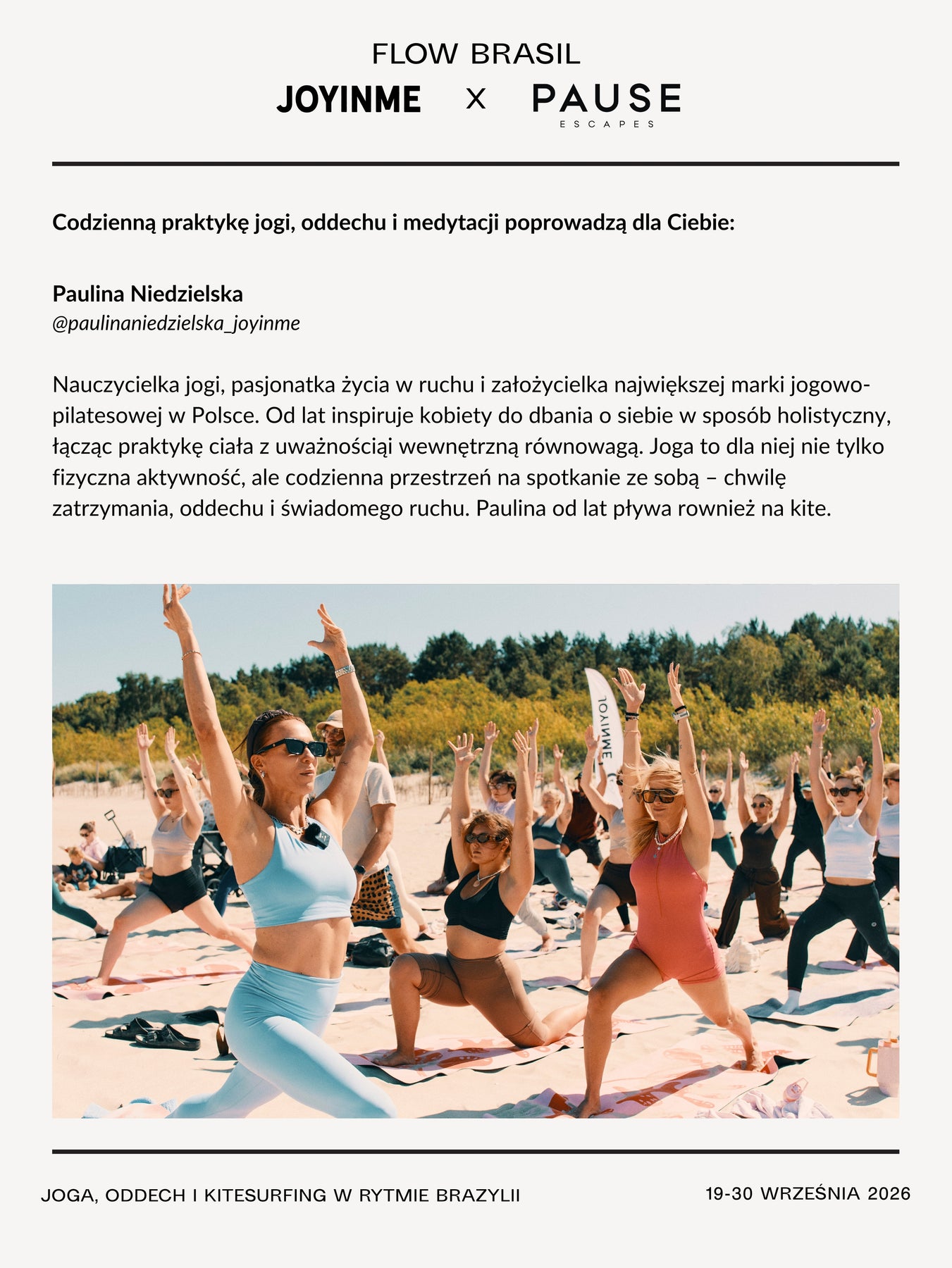 Paulina Niedzielska is a yoga teacher, passionate about life in motion, and founder of the largest yoga and Pilates brand in Poland. For years, she has inspired women to take holistic care of themselves, combining bodywork with mindfulness and inner balance. For her, yoga is not just a physical activity, but a daily space for self-discovery—a moment to pause, breathe, and move consciously. Paulina has also been kitesurfing for years.